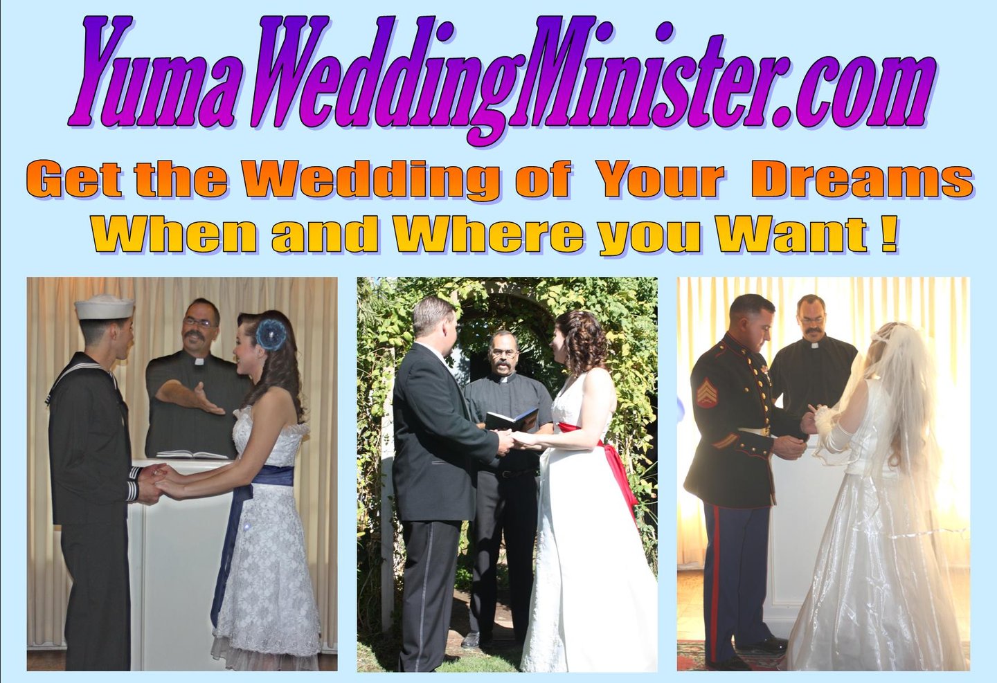 I would be honored to marry you in a place of your choice. At my Wedding Chapel, in a Park, at your Home, jumping from a Plane or riding a Horse.
